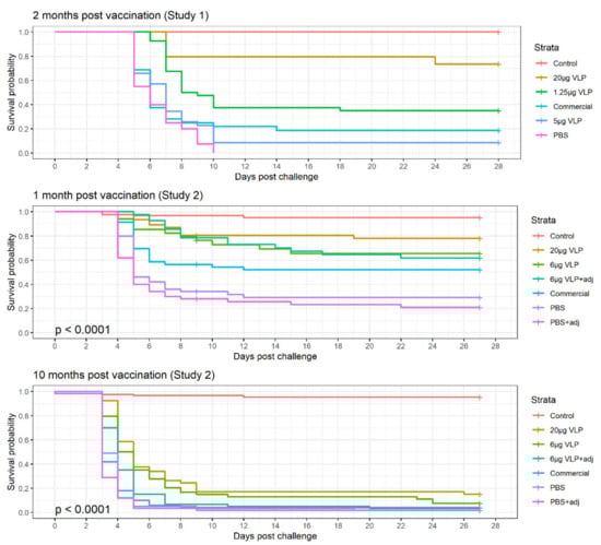 In Study 1, survival in the group receiving VLP 20 µg was significantly different from the other groups (p > 0.001), while the VLP 5 µg, 1.25 µg and commercial vaccine were not significantly different from each other.
