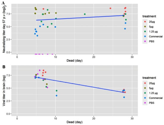 Data on individual fish. (A) Neutralizing titer before challenge and (B) RGNNV virus titer (TCID50/g) isolated from brain tissue from dead/moribund fish as a function of the day the fish was terminated/diseased. The titers were log transformed to obtain linearity. The colors indicate the treatment (20, 5 or 1.25 µg VLP, commercial vaccine or PBS).