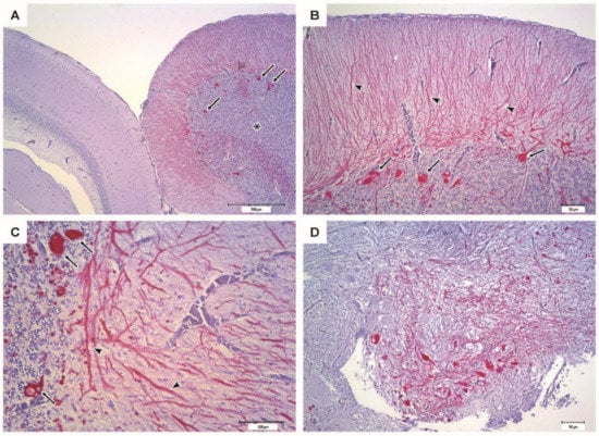 Immunohistochemistry of the encephalon from moribund sea bass (PBS, negative control group). Bright red coloring indicates the presence of RGNNV antigens. (A–C) Cerebellum (*) with intense immunostaining at different magnifications; the cortical of the optic lobes appears scarcely affected. Cerebellar Purkinje cell soma (arrows) appears strongly IHC positive, while their dendritic process (arrowheads) is also highlighted in the molecular layer. (D) Diencephalon showing intense immunostaining.