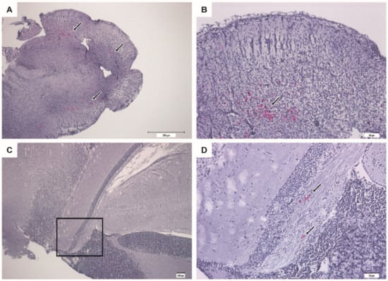 Immunohistochemistry of brain from vaccinated surviving sea bass (VLP 20 µg/fish). Bright red immunostaining indicates the presence of RGNNV antigens. (A,B) Cerebellum at different magnifications showing mild coloring (arrows). (C,D) Mesencephalon with scattered staining (arrows). (D) Higher magnification of the squared section in (C).