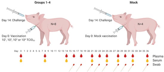 The animal study was approved by the Wageningen Bioveterinary Research (WBVR) ethical committee (permit #2014199) and humane endpoints were defined. A total of 36 piglets, approximately 8 weeks of age at the start of the experiment, were randomly allotted to 4 treatment groups of 8 animals and one control group of 4 animals. Piglets were purchased from a high-health farm and were not vaccinated. The sows on this farm were vaccinated before farrowing against E. coli and Clostridium, rotavirus, and streptococcus. One week after farrowing, sows were vaccinated against porcine parvovirus and swine erysipelas. Each group of piglets was housed in an isolation unit of 9 m2 in the High Containment facility of WBVR. Pigs were fed once per day and potable water was available ad libitum.