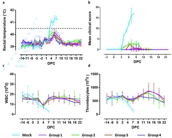 The mean values of the thrombocyte counts are depicted in Figure 2d. All mock-vaccinated animals displayed thrombocytopenia on 7 DPC, with counts varying from 184 × 109 to 61 × 109 cells/L. None of the vaccinated animals developed thrombocytopenia post challenge, except for one animal in group 2 on 18 DPC.