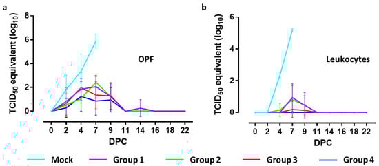 Four days after challenge, all mock-vaccinated animals contained viral RNA in isolated leukocytes, with titers ranging from 2.14 and 2.49 log10 TCID50-eq/mL. On 7 DPC, maximum titers ranging from 5.05 and 5.28 TCID50-eq/mL were detected.