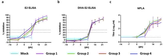 Detection and antibodies by E2 (DIVA) ELISA and NPLA. Results are presented as mean antibody levels (% Inhibition) as determined by the IDEXX E2 ELISA (a) and the DIVA E2 ELISA (b). Cut-offs (dotted lines) were set at 40% inhibition; ≥30%: doubtful, ≥40%: positive. The cut-off of the NPLA (c) was set at 0.7. Error bars represent SD.