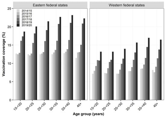 For each season, VC was defined as the number of women who were pregnant during the respective season and received influenza vaccination during that season over the total number of women who were pregnant during that season. VC was calculated for Germany as a whole, as well as according to region (east vs. west) and age group (15 to <20, 20 to <25, 25 to <30, 30 to <35, 35 to <40, and 40+ years). For the comparison of east and west Germany, ASHIPs were classified into eastern (Berlin, Brandenburg, Mecklenburg-Western Pomerania, Saxony, Saxony-Anhalt and Thuringia) and western federal states (Baden-Wuerttemberg, Bavaria, Bremen, Hamburg, Hesse, North Rhine-Westphalia, Rhineland-Palatinate, Saarland, Schleswig-Holstein).