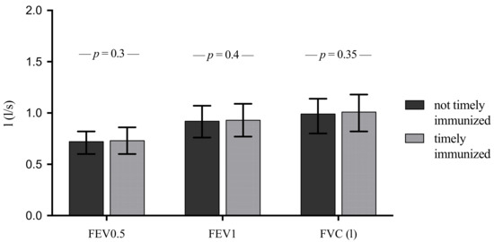 Non-timely immunized infants had more parent-reported episodes of bronchitis at the age of 5 years than timely immunized infants (2.11 vs. 1.17, p = 0.01; Table 3) in univariate analyses. Children that had been timely immunized had a decreased risk of bronchitis at 5 years of age (logistic regression, OR = 0.60; CI: 0.42–0.86) and the frequency of overall bronchitis episodes (linear regression, effect size B = −0.09; 95% CI: −1.36–−0.1) independent of BPD, gestational age, SGA status, sibling- and smoke- exposure at home and daycare (Figure 2). In order to address heterogeneity in the quality of care between the centers or regional risk factors for bronchitis (i.e., air pollution), we added facility-fixed effects to our analyses. We still found a negative, statistically significant correlation between timely immunization and the occurrence of bronchitis within the 5th year (OR 0.56; 95% CI 0.3–0.9; p = 0.01) and the use of bronchitis medication within the last year at the age of 5 years (OR 0.57; 95% CI 0.35–0.9; p = 0.02), whereas the negative correlation between timely immunization and number of bronchitis episodes didn´t reach statistical significance (regression coefficient B −0.606; 95% CI −1.5–0.3; p = 0.19). Likewise, we added year-fixed effects to our analyses in order to address different vaccines used throughout the year (i.e., PCV-7, PCV-10 and PCV-13). We found a negative, statistically significant correlation between timely immunization and the occurrence of bronchitis within the 5th year (OR 0.6; 95% CI 0.4–0.9; p = 0.025) and the use of bronchitis medication within the last year at the age of 5 years (OR 0.63; 95% CI 0.4–0.9; p = 0.024), whereas the negative correlation between timely immunization and number of bronchitis episodes didn´t reach statistical significance (regression coefficient B −0.338; 95% CI −1.13–0.45; p = 0.4). In terms of spirometry parameters at the 5-year follow-up, such as forced expiratory volume in 0.5 s (FEV0.5), forced expiratory volume in 1 second (FEV1) or forced vital capacity (FVC), there was no notable influence of timely vaccination (hexavalent, pneumococcal and heptavalent; Figure 3.