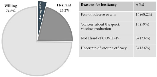 Willingness and hesitancy regarding COVID-19 vaccination in celiac disease patients and reasons for hesitancy.