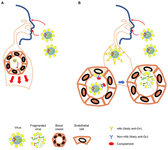 Figure 2. Orthohantavirus infection in the naïve and the Hantavax-vaccinated. (A) In the naïve individual, infectious viral particles entering through eyes, airways, or open skin may infect endothelial cells in the local blood vessels (light red arrows) and spread to other parts of the body (heavy red arrows) [61]. (B) In the Hantavax-vaccinated individual, the entering viral particles might be neutralized by nAb. Non-nAb in the vaccinated may work through the Fc function to destroy the virus particle or infected cells leading to the next phase of immune responses targeting internal proteins of the virus (blue arrows). Blood vessels are exaggerated to show virus infection of the endothelial cells and immune responses in the vaccinated after infection.
