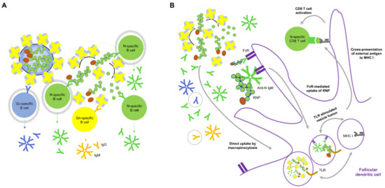 We have discussed the potential role for non-nAb, N-specific antibodies in enhancing N-specific T cell responses, schematically analyzing existing studies. It is not known whether orthohantavirus could be neutralized intracellularly by anti-N antibodies as seen in intracellular neutralization of rotavirus by anti-VP6 antibodies [79]. The RNP of enveloped orthohantavirus is not likely exposed in endosomes, where intracellular antibodies are known to function, unlike the nucleocapsid protein VP6 of non-enveloped rotavirus. Since anti-N antibodies were shown not to have a neutralizing activity in the in vitro infection assay [43], a role for anti-N antibodies needs to be investigated in an in vivo context. There is a report that mice vaccinated with recombinant NP (rNP) of influenza virus plus LPS could be protected from influenza virus challenge [80]. In this study, vaccination induced high titers of anti-NP antibodies in the serum but limited NP-specific CD8 T cell responses. Interestingly, transfer of rNP immune sera could protect the recipient mice from influenza virus challenge only when the T cell functions of the recipient mice were intact. The requirement of functional T cells for protection by anti-NP antibodies appears to overlap with our conceptualization of anti-N antibody function in Figure 3B. The poor NP-specific CD8 T cell response after vaccination in this study might have been due to using LPS as an adjuvant, which binds to TLR4 in the plasma membrane, not in the endosome [81]. Coincidentally, the influenza virus is similar to orthohantavirus in terms of being an enveloped virus containing a segmented single-stranded RNA genome [82]. However, many of the mechanisms of non-nAb antibody and T cell responses suggested in other viruses have not been proven experimentally yet for orthohantavirus and its specific vaccine types.