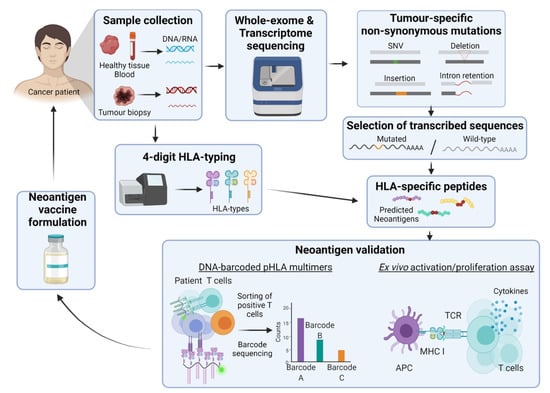 Neoantigens are perceived to be key to unique, personalized cancer vaccines. In the past, the comprehensive and fast identification of neoantigens along with progress into the field of research was limited by technologies. Today, advancements in the field of high-throughput screening, including whole-genome and whole-exome sequencing, are contributing to the identification of neoantigens closing the gap between theory and practice. These pipelines include the sequencing and comparison of healthy and cancer tissues to identify tumour-specific non-synonymous mutations (Figure 1) [142]. Bioinformatic algorithms are integral to this pipeline by using different parameters that include translation rate of mutated vs. wild-type sequences to protein/peptide, probability of immunological tolerance, protein/peptide recognition by APCs, HLA binding affinity and binding affinity between the peptide-HLA and the T-cell receptors. To date, there are more than a dozen algorithm-based software with one of the newest programs being NeoPredPipe developed by Schenck et al. in 2019 [143]. Based on what is observed by sequencing, and predictive algorithms, key neoantigens are selected for antigenicity verification and presentation using mass spectrometry and affinity chromatography [142,144]. As only a small proportion of predicted neoantigens exist, validation is a crucial step in the selection of these tumour antigens incentivizing the development of new technologies for this purpose [145]. One of the latest approaches utilizes DNA barcodes to label Major Histocompatibility Complex (MHC) loaded with the neoantigens of interest to test the presence of T-cell clones able to recognize these structures in clinical samples [146,147].
