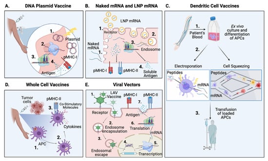 Cancer vaccine delivery methods. Various delivery strategies used to expose patients to immunogenic tumour antigens. (A) DNA Plasmid Vaccine. (1) DNA plasmids encoding cancer antigens are injected intramuscularly or pushed into myocytes using electrical pulses from a gene gun. (2) The host cells transcribe and (3) translate the given tumour antigens. (4) Tumour antigens peptides will be presented to immune cells on MHC-I molecules or alternatively secreted and then taken by APCs. (B) Naked mRNA and Lipid Nanoparticle (LNP) mRNA. (1) LNP mRNA is delivered to host cells via systemic or intramuscular injection and uptaken by the cells through specific ligand/receptor interactions. Naked mRNA is administered via intra-lymph node or intra-muscular injection. (2) Lower endosomal pH triggers LNPs to release mRNA cargo in the cytosol of the cell. (3) mRNAs are translated by the cell ribosomal machinery. (4) Tumour antigen peptides will be presented to immune cells as pMHC-I and/or pMHC-II (only on APCs) complexes. (C) Dendritic Cell Vaccines. (1) Ex vivo differentiation of patient’s blood cells into APCs. (2) APCs will be loaded with the tumour antigens of interest using either electroporation, where electrical pulses make cells temporarily permeable, or cell squeezing, where a microfluidic flow temporarily deforms the cell plasma membrane to create pores enabling the passage of therapy into cells. (3) Modified cells can then be transfused back into the donor patient. (D) Whole Cell Vaccines. (1-2) Subcutaneous injected allogenic or autologous tumour cells will be uptaken and processed by APCs. (3) Activated APCs secreting cytokines and expressing co-stimulatory molecules, will mediate the recognition of pMHC-II by T-cells (E) Viral Vectors. (1-3) Injected viral particles, enter the cell by receptor mediated endocytosis and released into the cytosol. (4) In the case of DNA life attenuated viruses, viral genome containing the encoded tumour antigens is transferred into the host nucleus and (5) transcribed into mRNA. (6) The therapeutic mRNA is translated in the cytosol to protein(s)/peptide(s). (7) mRNA products will be secreted either/or presented by MHC complexes on the surface of the cell. (Created in BioRender.com).