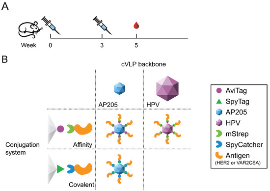 Study setup. (A) Groups of mice (n = 6) were immunized prime-boost and serum was collected 2 weeks after the final immunization to evaluate the vaccine-induced IgG response elicited against the cVLP-displayed antigen. (B) Capsid virus-like particles (cVLPs) displaying either SpyTag or biotinylated AviTag were mixed with antigens genetically fused to SpyCatcher or monomeric streptavidin (mStrep), respectively. Two different model antigens (HER2 and VAR2CSA) were used. The AP205 cVLP consists of 180 subunits and has a diameter of approximately 30 nm, while the human papillomavirus (HPV) major capsid protein (L1) cVLP consists of 360 subunits and has a diameter of approximately 55 nm.