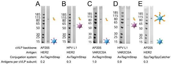 Vaccine coupling efficiency. After purification by ultracentrifugation and dialysis, the coupling efficiency of each vaccine was measured by SDS-PAGE densitometry. During reducing SDS-PAGE, the affinity-based AviTag:mStrep-conjugation is disassembled (A–D), while the covalent SpyTag:SpyCatcher-conjugation is maintained (E). (A) AviTag-AP205:mStrep-HER2. (B) AviTag-HPV:mStrep-HER2. (C) AviTag-AP205:mStrep-VAR2CSA. (D) AviTag-HPV:mStrep-VAR2CSA. (E) SpyTag-AP205:SpyCatcher-HER2. The number of antigens per cVLP subunit was calculated based on the relative intensities of protein bands present in each lane (see Supplementary Table S1 for a detailed explanation).