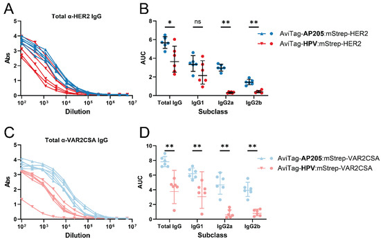 Effect of the cVLP backbone on IgG profile. Mice (n = 6) were immunized with antigen coupled to either HPV or AP205 through the non-covalent AviTag:mStrep interaction. The doses of HER2 and VAR2CSA were 2 µg and 1.19 µg antigen respectively. Antigen specific antibodies were quantified by ELISA. (A) Total anti-HER2 IgG dilution curves and (B) Area under the curve (AUC) for Total IgG, IgG1, IgG2a and IgG2b. (C) Total anti-VAR2CSA IgG dilution curves and (D) AUC for total IgG, IgG1, IgG2a and IgG2b. Each dot represents one animal. Full dilution curves are available in Supplementary Figure S2. Not significant (ns) p > 0.5; * p ≤ 0.5; ** p < 0.01.
