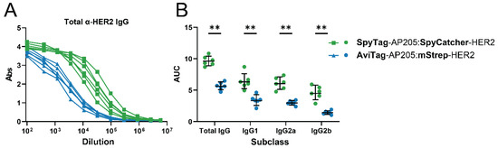 Effect of conjugation system on IgG profile. Mice (n = 6) were immunized with 2 µg HER2 coupled to AP205 cVLPs using either a covalent (SpyTag/SpyCatcher) or affinity-based (AviTag/mStrep) conjugation system. HER2-specific antibodies were quantified by ELISA. (A) Total IgG dilution curves and (B) AUC for total IgG, IgG1, IgG2a and IgG2b. Each dot represents one animal. Full dilution curves are available in Supplementary Figure S2. ** p < 0.01.