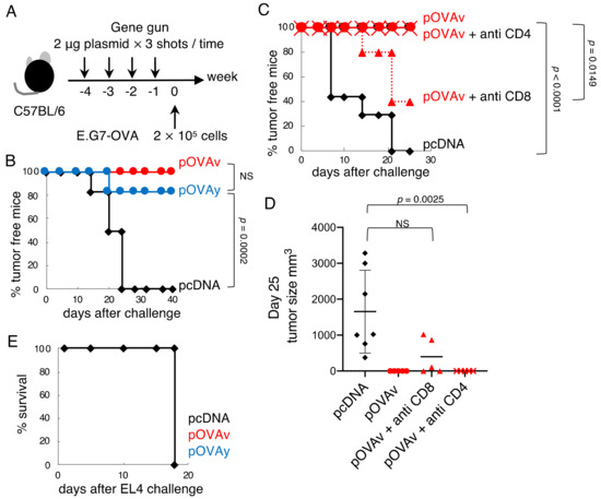 3.2. Anti-Tumor Effect of pOVAv and pOVAy with a Gene Gun