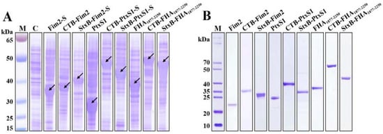 To enhance the immunogenicity of the pertussis antigens, we first fused CTB or StxB to the N-terminals of Fim2, PtxS1, or FHA1877–2250 by constructing pET-CTB-Fim2 and pET-StxB-Fim2-SUMO, pET-CTB-PtxS1-SUMO, pET-StxB-PtxS1-SUMO, and pET-CTB-FHA1877–2250 and pET-StxB-FHA1877–2250 expression vectors, respectively. Some of these also included a fused 6×His tag and SUMO tag at the C-terminal end to allow their soluble expression. In addition, we also constructed vectors (pET-Fim2-SUMO, pET-PtxS1, and pET-FHA1877–2250) to express the three antigens alone. After transformation of these vectors into Escherichia coli BL21 cells and IPTG induction, the whole-cell sample of each strain was analyzed by SDS–PAGE and Coomassie blue staining. The results show the detection of high expression bands at approximately 34, 27, and 36 kDa in the antigen-only lanes, which correspond to the molecular weights of Fim2-SUMO (Fim2-S), PtxS1, and FHA1877–2250, respectively. Increases in the molecular weights of these fusion protein bands were observed in the lanes containing CTB-Fim2, StxB-Fim2-SUMO (StxB-Fim2-S), CTB-PtxS1-SUMO (CTB-PtxS1-S), StxB-PtxS1-SUMO (StxB-PtxS1-S), CTB-FHA1877–2250, and StxB-FHA1877–2250, which also corresponded with their expected molecular weights (Figure 1A). Following purification through affinity chromatography and removal of the SUMO tags (if present), Coomassie blue staining were performed, and the purity of the obtained proteins was found to be over 90% (Figure 1B), which met the requirements for use in subsequent animal experiments.