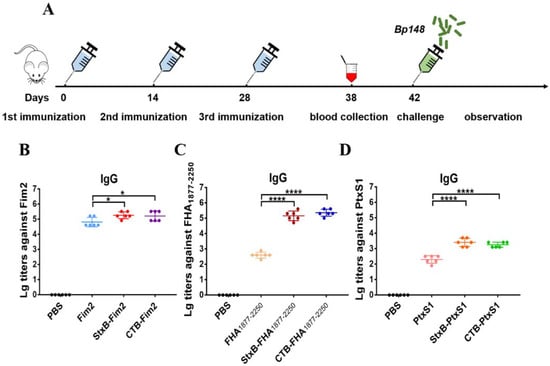 Antigen-specific serum antibody responses in mice after immunization. (A) Schematic diagram of the mouse immunization and evaluation experiment. (B) Serum IgG antibody titers against Fim2 antigen in mouse groups after their immunization with PBS, Fim2, StxB-Fim2, or CTB-Fim2. (C) Serum IgG antibody titers against FHA1877–2250 antigen in mouse groups after their immunization with PBS, FHA1877–2250, StxB-FHA1877–2250, or CTB-FHA1877–2250. (D) Serum IgG antibody titers against PtxS1 antigen in mouse groups after their immunization with PBS, PtxS1, StxB-PtxS1, or CTB-PtxS1. The serum antibody titer of each mouse was log10-transformated, and the data are expressed as means ± SD. A one-way ANOVA with Dunnett’s multiple-comparison test was used for each multiple-group comparison (**** p < 0.0001 and * p < 0.05).
