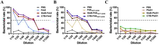 Evaluation of mice serum bactericidal activity. Different dilutions of serum from immunized mice (with inactived complement), B. pertussis suspension, and complement were co-incubated and cultured to enumerated colonies. The in vitro serum bactericidal activity was then calculated via comparison with the blank control group (without serum). (A) In vitro bactericidal efficiency of different dilutions of serum from mice in the PBS, Fim2, StxB-Fim2, and CTB-Fim2 groups. (B) In vitro bactericidal efficiency of different dilutions of serum from mice in the PBS, FHA1877–2250, StxB-FHA1877–2250, and CTB-FHA1877–2250 groups. (C) In vitro bactericidal efficiency of different dilutions of serum from mice in the PBS, PtxS1, StxB-PtxS1, and CTB-PtxS1 groups. The dotted lines represent the serum bactericidal rate of 50%.