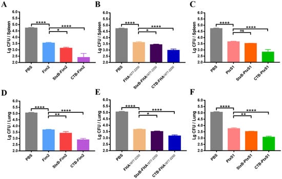 Bacterial loads in the spleens and lungs of immunized mice. (A) Bacterial loads in the spleens of mice from the PBS, Fim2, StxB-Fim2, and CTB-Fim2 groups. (B) Bacterial loads in the spleens of mice from the PBS, FHA1877–2250, StxB-FHA1877–2250, and CTB-FHA1877–2250 groups. (C) Bacterial loads in the spleens of mice from the PBS, PtxS1, StxB-PtxS1, and CTB-PtxS1 groups. (D) Bacterial loads in the lungs of mice from the PBS, Fim2, StxB-Fim2, and CTB-Fim2 groups. (E) Bacterial loads in the lungs of mice from the PBS, FHA1877–2250, StxB-FHA1877–2250, and CTB-FHA1877–2250 groups. (F) Bacterial loads in the lungs of mice from the PBS, PtxS1, StxB-PtxS1, and CTB-PtxS1 groups. Data are expressed as the means ± SD and were analyzed by a one-way ANOVA with Dunnett’s multiple-comparison test for the multiple-group comparisons (* p < 0.05, ** p < 0.01, **** p < 0.0001).