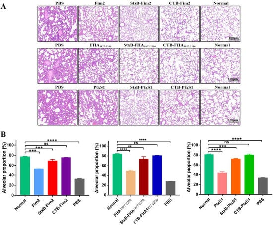 Given the success of the CTB- and StxB-based vaccines at increasing bacterial clearance in the lungs of mice, we next applied a previously tested immunization and challenge protocol and then conducted HE staining of lung tissues on Day 7 after the mice were infected with a dose of 1 × 108 CFU/mouse B. pertussis to further analyze the protection induced by the vaccines. In line with our bacterial load observations, the HE staining analysis of dissected lungs revealed similar trends in injury and pathology levels for each of the different treatments. Compared with the uninfected mice, the lungs of mice in the PBS group showed severe tissue injury, which mainly presented as decreased alveolar expansion, alveolar structure disruption, lung interstitial expansion and inflammatory cell infiltration, and poor overall pulmonary ventilation. Although pathological damage was alleviated in the lungs from the three groups of mice immunized with antigen alone, the aforementioned severe pathological changes were still present. In contrast, we found that mice immunized with CTB- or StxB- fused antigens, particularly CTB-fused ones, had almost no lung injury after infection (Figure 5A). In addition, we quantitatively analyzed lung damage through the proportion of alveolus, and the results also showed that the CTB- or StxB-based vaccines provide strong protective effects (Figure 5B). Therefore, these findings suggest that—compared with immunization with antigen alone—immunization with CTB- or StxB-based vaccines results in better lung protection after infection with B. pertussis.