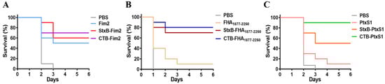 Survival of immunized mice after lethal challenge with B. pertussis. At day 14 after the last immunization, all mice were challenged intraperitoneally with a dose of 6 × 108 CFU/mouse B. pertussis. Mice were monitored for 6 days, and their survival rates were recorded. (A) Survival of mice in the PBS, Fim2, StxB-Fim2, and CTB-Fim2 groups after challenge. (B) Survival of mice in the PBS, FHA1877–2250, StxB-FHA1877–2250, and CTB-FHA1877–2250 groups after challenge. (C) Survival of mice in the PBS, PtxS1, StxB-PtxS1, and CTB-PtxS1 groups after challenge.