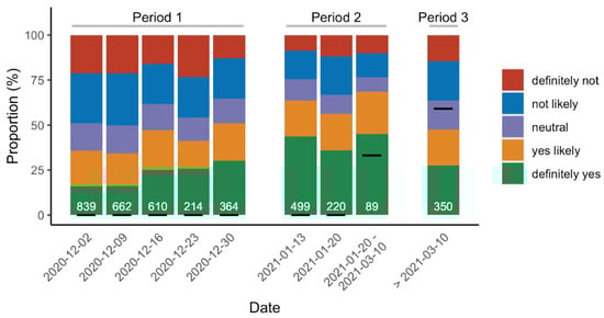 Time course of raw-willingness score to be vaccinated against COVID-19. White numbers represent the number of participants enrolled each week (poll time points). Participants were categorized in 5 groups according to their self-reported crude willingness to be vaccinated against COVID-19 (1 to 7 scale): definitely, yes (7), yes, likely (5–6), neutral (4), not likely (2–3), definitely, not (1). Black bars show the proportion of vaccinated respondents. Period 1: no vaccine available. Period 2: BNT162b2 mRNA vaccine available for healthcare workers >50 years and AZD1222 adenovirus vaccine for those <50 years. Period 3: BNT162b2 mRNA vaccine for any healthcare worker, and AZD1222 adenovirus vaccine for those >55 years only (after a temporary ban for safety concerns).