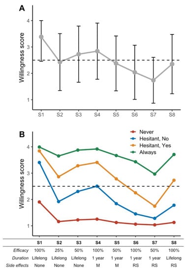 Trajectory of responses to vaccine scenarios and clustering. Eight vaccine candidate scenarios were submitted to participant in the same order from #1 (S1, ideal vaccine candidate conferring a lifelong immunity with 100% efficacy and no adverse events) to #8 (S8). Vaccine efficacy ranges from 25% to 100%. Immunization duration was 1-year to lifelong. Side effects were absent, moderate (M) or rare but severe (RS). Participant scored (1 to 4 scale) each scenario according to their willingness to be vaccinated with the proposed candidate from 1 (“Not at all”) to 4 (“Definitely”). (A) Average trajectory of responses across the scenarios; error bars represent standard-deviations, dashed horizontal line the limit between scores in favor (above) or in disfavor (below) of vaccine acceptance. (B) Average trajectories of vaccine acceptance for the four clusters obtained using a k-mean algorithm for longitudinal data (see methods): “Never” group in red, “Always” group in green, “Hesitating but willing” group in yellow and “Hesitating and not willing” group in blue.