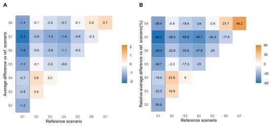 Vaccine willingness across scenarios among hesitating healthcare workers. Absolute (A) and relative (B) differences of the average score for vaccine-willingness (scale from 1 to 4) between a reference scenario with an ideal vaccine candidate (abscissa) and subsequent scenarios (ordinate) among hesitating 2240 participants (A). In (B), the relative percentage of variation in mean difference is given.
