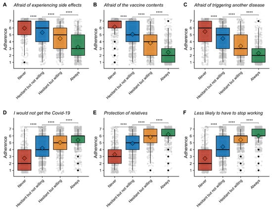 The k-means algorithm clustered participants into four subgroups for vaccine acceptance (Figure 3B): those with almost constant negative answers (group “Never”), those with almost constant positive answers (group “Always”), and the two remaining hesitant groups despite a trend to rather positive (“Hesitant but willing” group) or negative (“Hesitant but not willing” group) willingness.
