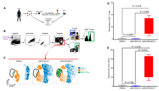In vitro evaluation of BZLF1 immunogen through DC: PBMC CoCx, followed by HLA-pentamer loaded with BZLF1 RAK peptide and flow cytometry; (A) Schematic of the CoCx experiments; (B) Gating scheme for pentamer flow data; (C) viSNE immunome maps that show distinct clusters representing different immune cell types; (D) Frequency of RAK+ T-cells from PBMCs, αDEC205-Ctrl CoCx, and αDEC205-BZLF CoCx across 4 HLA-B8 donors; (E) Absolute count of RAK+ T-cells from PBMCs, αDEC205-Ctrl CoCx, and αDEC205-BZLF CoCx across 4 HLA-B8 donors.