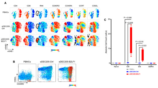 Characteristics of EBV-specific cells in the CoCx: (A) The viSNE maps, colored by the intensities of individual immune marker expression (CD4, CD8, RAK, CD45RO, CD45RA, CCR7, and CD62). For each marker tested, cells were separated according to the expression of particular marker. RAK+ memory T-cells generate on the αDEC205-BZLF1 CoCx were evenly distributed between the CCR7+ (black arrow 1) and CCR7− (black arrow 2). Majority of the RAK+ cells expanded on the αDEC205-BZLF1 are CD62L+ (black arrow 3) while fewer were CD62L− (black arrow 4); (B) Biaxial plots of CD8+ T-cells with CD45RO on the X-axis versus CD62L on the Y-axis. Events on the biaxial plots colored according to the RAK intensity expression which confirmed that the memory EBV-specific cells from the PBMCs and αDEC205-Ctrl lack the lymphocyte homing marker, CD62L, while the majority of the RAK+ cells generated from the αDEC205-BZLF1 are CD62L+; (C) RAK+ naïve and memory subsets calculated from PBMCs, αDEC205-Ctrl CoCx, and αDEC205-BZLF CoCx across 4 HLA-B8 donors.