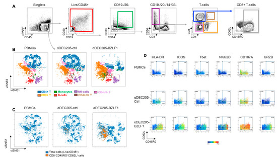 We next evaluated the immunophenotype of CoCx products by utilizing mass cytometry with a larger panel of antibodies (Table S1). We executed immunophenotypic analysis of the data through manual gating (Figure 3A and Figure S4) and by automated viSNE clustering using surface and intracellular immune markers. An example of viSNE overlaid immunome maps of PBMCs, αDEC205-Ctrl, and αDEC205-BZLF1 from donor D-9 is displayed in Figure 3B. Both manual gating and the viSNE maps show distinct clusters representing different cell types. We observed expansion of CD8+ T-cells and contraction of CD4+ T-cell subsets in αDEC205-BZLF1 CoCx compared to αDEC205-Ctrl and PBMCs. We also observed an expansion of CD4/CD8 double-positive T-cells and CD4/CD8 double-negative T-cells on αDEC205-BZLF1 CoCx. Double-positive T-cells are frequently associated with control of viral infections such as HIV [43] and EBV [44]. Delayed recovery of double-negative T-cells is associated with EBV reactivation [45].