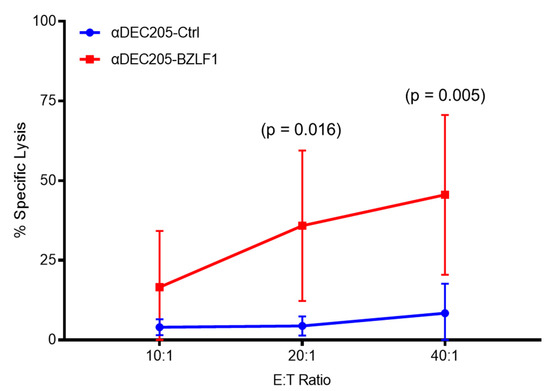 These observations strongly suggest that CTL cells produced in the αDEC205-BZLF1 CoCx can exert a cytotoxic function and could induce a highly effective immune clearance of EBV-infected B-cells. To evaluate the CTL functional activity, we performed a flow cytometry-based cytotoxicity assay using autologous EBV-immortalized LCLs pulsed with BZLF1 pepmix as target cells. Effectors and target cells were incubated for 4 h at specified effector:target (E:T) ratios. The results were analyzed with a linear mixed effect model (adjusted for multiple comparisons) and show that effector cells from αDEC205-BZLF1 CoCx have significantly higher killing activity both at 20:1 (p-value = 0.0163) and 40:1 (p-value = 0.0051) E:T ratio, compared to the αDEC205-Ctrl CoCx product (Figure 4).