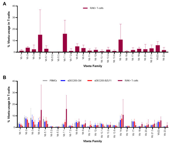 BZLF1-specific T-cells (RAK+ T-cells) expanded in αDEC205-BZLF1 CoCx were sorted by fluorescence-activated cell sorting (FACS) to purity using an EBV pentamer. Sorted RAK+ T-cells (1 million cells per reaction) from 4 donors and their counterpart PBMCs, αDEC205-Ctrl CoCx product, and αDEC205-BZLF1CoCx product were subjected to quantitative analysis of their T-cell receptor (TCR) Vbeta (Vβ) repertoire by flow cytometry using the IOTest Beta Mark kit (Beckman Coulter, Brea, CA, USA). The IOTest Beta Mark kit contains monoclonal antibodies (mAbs) against 24 of the TCR-Vβ which covers approximately 70% of the normal human CD3 TCR Vβ repertoire populations. Results were compared to the reference normal range for TCR repertoire for peripheral blood which was computed by the OSU Department of Pathology, Laboratory of Flow Cytometry on 100 healthy volunteers and on data from the IOTest Beta Mark kit (Beckman Coulter, Brea, CA, USA).