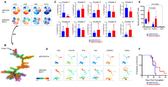 In vivo evaluation of the αDEC205-BZLF immunogen; (A) The viSNE maps, colored by the intensities of individual immune marker expression (CD3, CD4, CD8, and CD19); (B) FlowSOM minimal spanning tree (MST) on HuCD3+ T-cells showed both HuCD4+ T-cells and HuCD8+ T-cells; (C) Percentage of T-cell population from each vaccination group (αDEC205-Ctrl CoCx and αDEC205-BZLF) in each FlowSOM meta-cluster; (D) FlowSOM minimal spanning tree (MST) colored by the intensities of individual immune marker expression (CD8, HLA-DR, IFNγ, Tbet, CD45RO, and CD62); (E) Ex-vivo immune responsiveness to recall antigens (autologous LCLs, BZLF1 pepmix, and anti-TCR) by ELISpot; (F) Log-rank test: BZLF vaccine significantly delayed lymphoma development.