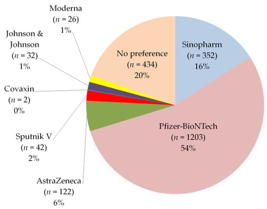 After medical and scientific websites (28%), around 14% of participants showed that Jordan’s public media channels are the second source for COVID-19 vaccine-related information, followed by social media platforms (11%) (Table 2). Based on their personal knowledge and beliefs about COVID-19 vaccines, most of the participants (54%) expressed that they would prefer to get Pfizer-BioNTech vaccine if they can choose before vaccination, 20% had no preferred vaccine, and 16% of them preferred the Sinopharm vaccine (Figure 1).
