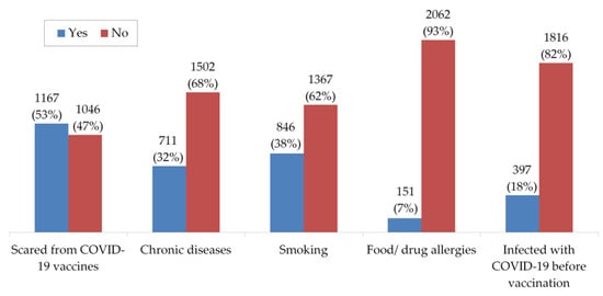 Furthermore, more than half of participants reported that they were initially scared from the side effects of COVID-19 vaccines. About 32% of the participants are suffering from chronic diseases, 18% were previously infected with COVID-19, 38% are smokers, and less than 7% have food and drug allergies (Figure 2).