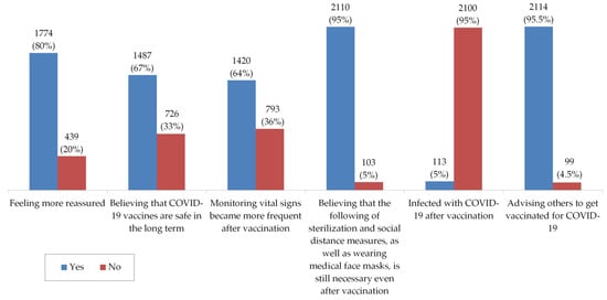 Only 5% of the study’s participants reported that they had been infected with COVID-19 after receiving a vaccine. After getting vaccinated, most of the participants felt more reassured (80%) and have advised others to get vaccinated too (95%). Most participants (95%) also believed that keeping prevention measures is still necessary after vaccination, while 67% and 64% of them believed that COVID-19 vaccines are safe for the long term and that they began to monitor their vital signs more frequently after getting vaccinated, respectively (Figure 3).