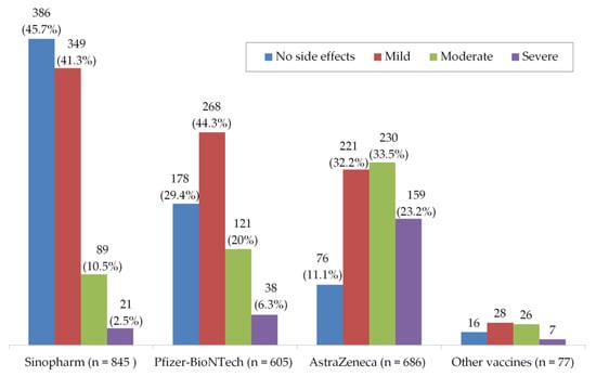 Although all COVID-19 vaccines cause similar post-vaccination side effects, both the severity and number of these side effects were significantly associated with vaccine type (p = 0.00); AstraZeneca > Pfizer-BioNTech > Sinopharm. The frequencies of some side effects were also significantly associated with vaccine type. The following are the side effects that are significantly associated with types of vaccines (in descending, and with p-value): injection site pain and swelling (Pfizer-BioNTech > AstraZeneca > Sinopharm, p = 0.00); chills (AstraZeneca > Pfizer-BioNTech > Sinopharm, p = 0.02); sore or dry throat, clogged nose, and runny nose (Sinopharm > AstraZeneca > Pfizer-BioNTech, p = 0.02); sleepiness and laziness (AstraZeneca > Sinopharm > Pfizer-BioNTech, p = 0.00). Overall, these differences may be attributed to the nature of each vaccine and their mechanisms of action.