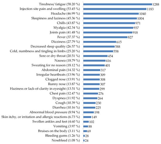 A wide spectrum of potential post-vaccination side effects has been assessed among participants in the present study. Figure 6 represents the frequencies of all these side effects, regardless of the type of received COVID-19 vaccine. The most common side effects were fatigue/tiredness (58.20%), injection site pain and swelling (53.45%), headache (46.99%), sleepiness and laziness (45.36%), chills (43.87%), myalgia (42.34%), joints pain (41.48%), and fever (37.37%), respectively. Other side effects were less common among vaccinated participants (Figure 6).