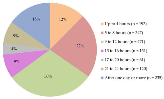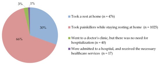 Regarding the time required for post-vaccination side effects to begin, participants’ responses showed that side effects mostly appeared within 9–12 h of vaccine injection (35%). Around 26% of participants reported that side effects started after 5–8 h, while 15% within up to 4 h (Figure 7). Furthermore, more than half of them (56%) stated that these side effects lasted for one to three days, and 30% for less than one day (Figure 8). To relieve post-vaccination side effects, most of the participants (66%) took painkillers with staying at home, without the need for hospitalization, or even to consult a doctor, while 31% of them took only a rest at home without any medication (Figure 9).