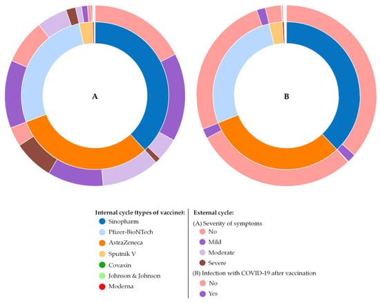 Sunburst illustrations represent the overall findings of the present study: COVID-19 vaccines that participants received, the severity post-vaccination side effects (A) and probability of post-vaccination infection (B).