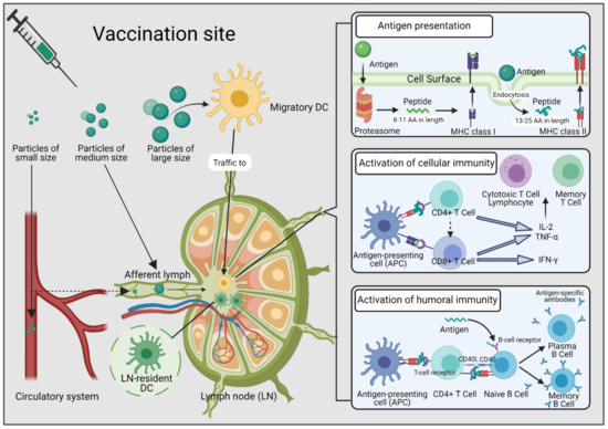 NPs with a size of 5–200 nm can drain to the lymph nodes directly, whereas assistance from migratory dendritic cells (DCs) is required for larger particles [34,35,36]. Nanovaccine-containing particles with a size that allowed for direct trafficking to the lymph nodes showed higher accumulation in lymph node-resident DCs [37]. Size was also found to influence the retention and presentation of nanovaccine in the lymph nodes. When 15, 50, and 100 nm nanoparticles were examined for their distribution in lymph nodes, all of them were taken up by follicular DCs; however, the 15 nm particles were cleared more quickly from the nodes (in days) and then from follicular DCs (through endolysosomal escape and formation of extracellular vesicle). By contrast, larger particles were retained in the lymph nodes for several weeks and induced stronger humoral immune responses [38]. However, the optimal size of nanovaccines for immunization may differ depending on the route of administration. For example, NPs less than 300 nm are the most effective at crossing mucus for intranasal delivery [39].