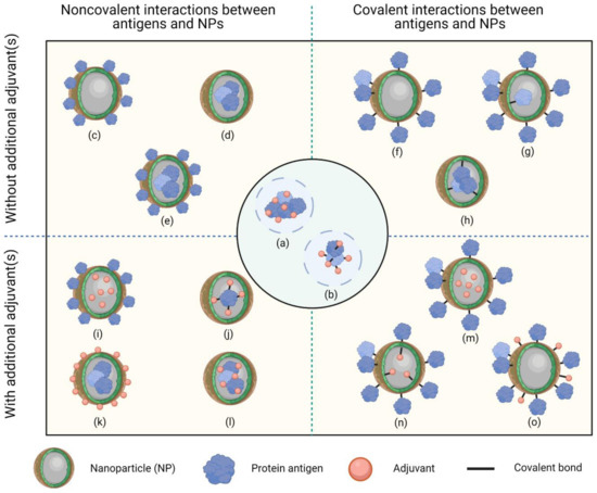 The most common designs of nanoparticle (NP)-based vaccines. Antigens can be associated with NPs via noncovalent interactions (left panels) or covalent interactions (right panels). Additional adjuvants can be incorporated into formulations to elicit stronger immune responses (bottom panels), or NPs can be administered on their own (top panels). (a) Antigen physically mixed with adjuvant through electrostatic or hydrophobic interaction. (b) Antigen conjugated to adjuvant via covalent bond. (c) Antigen coated onto the surface of NPs through electrostatic or hydrophobic interaction (in some cases, there may be multiple coating layers). (d) Antigen encapsulated in NPs. (e) Antigen coated onto the surface of NPs, as well as encapsulated within NPs. (f) Antigen conjugated to the outer surface of NPs. (g) Antigen conjugated to both the inner and outer surfaces of NPs. (h) Antigen conjugated to the inner surface of NPs. (i) Antigen coated onto the surface of NPs, with adjuvant encapsulated in the NPs. (j) Antigen–adjuvant conjugate encapsulated in NPs. (k) Adjuvant coated onto the surface of NPs, with antigen encapsulated in the NPs. (l) Mixture of antigen and adjuvant encapsulated in NPs. (m) Antigen conjugated to the surface of NPs, with adjuvant encapsulated in the NPs. (n) Antigen conjugated to the outer surface of NPs, with adjuvant conjugated to the inner surface. (o) Both antigen and adjuvant conjugated to the outer surface of NPs. NP, nanoparticle. Drawing created with Biorender.com (accessed 26 May 2021).