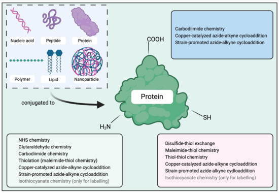 Conjugation strategies targeting different functional groups of proteins. Compounds, such as nucleic acids, peptides, proteins, polymers, lipids, and nanoparticles, can be conjugated to proteins via methods that target the amine, thiol, or carboxyl groups of proteins. NHS, N-hydroxysuccinimide. Drawing created with BioRender.com (accessed 26 May 2021).