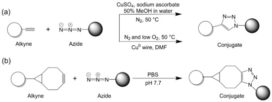 Copper-catalyzed azide-alkyne 1,3-dipolar cycloaddition (CuAAC) belongs to the family of “click” reactions [65]. CuAAC utilizes copper (Cu2+ or Cu0, such as copper wire) to catalyze a reaction between an alkyne and an azide group, with sodium ascorbate, hydrazine, or hydroxylamine as the reducing agent (Figure 4a) [65]. However, the use of copper wire as a sole reagent has also been reported [66,67,68,69]. CuAAC is a well-established method that has been extensively used for peptide–peptide or peptide–polymer conjugation [70,71]. The technique can be performed in living cells to modify cellular proteins, but yield from in vivo conjugation is low [72]. The conjugation efficiency of CuAAC reactions can be improved when the copper catalyzer is associated with polymeric NPs [73]. Alkyne and azide groups are not native to biomolecules; therefore, the application of this reaction for conjugation must always involve the introduction of azide and alkyne functional entities for intact biomolecules [65].