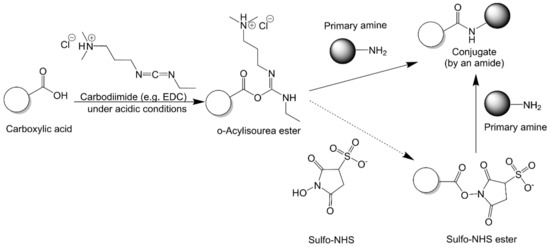 Carbodiimides are highly reactive reagents that can activate carboxyl groups to react with amine groups under mild conditions (Figure 5). To date, several carbodiimide molecules, such as 1-ethyl-3-(3-dimethyl-aminopropyl) carbodiimide (EDC) and dicyclohexylcarbodiimide (DCC), have become commercially available. Mechanistically, carbodiimide reacts with carboxylic acid to form an acylisourea intermediate that is subsequently displaced by primary amines to form an amide bond that links the two entities [85]. With a two-step procedure, where NHS is used to convert acylisourea into an NHS ester to further react with amine, conjugation efficiency can be largely improved [86]. Instead of standard NHS, this reaction typically uses sulfo-NHS, as it provides better water solubility. The good water solubility of both EDC and sulfo-NHS allows the conjugation to be performed under aqueous conditions without the use of organic solvents, which add uncertainty to protein stability, as solubility enhancers. Carboxyl group activation is often performed in slightly acidic conditions (pH 6.0 to 6.5) with morpholinoethanesulfonic acid sodium (MES; 0.1 M) buffer and NaCl (0.3 M) as the reaction media [87,88,89]. PBS buffer is also reported to be compatible for carboxyl activation [90]. The main shortcoming of this method is its low efficiency due to competing hydrolysis [81].
