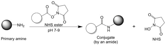 NHS esters can easily react with amines at pH 7–9 (Figure 6), even without carbodiimide pre-activation. However, NHS esters can also react with serine, tyrosine, and threonine hydroxyl residues in proteins, forming undesired conjugation sites [91,92]. Most NHS esters are water-insoluble, and thus they are often introduced to the conjugation media as aliquots in organic solvent, such as DMSO or DMF. However, the involvement of an organic solvent injects uncertainty into protein stability and conformation. Therefore, the amount of organic solvent in the final conjugation media should not exceed a pre-determined percentage (e.g., 10%) in order to preserve the structure and functionality of the proteins [93]. The water solubility of NHS esters can be increased by the inclusion of a charged sulfonate group, as described above [94]. Sodium phosphate buffer (0.1 M) and NaCl (0.15 M) at pH 7.2–7.5 have been recommended as a solvent for this conjugation method [93].