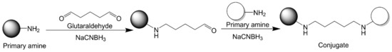 Glutaraldehyde is a homobifunctional crosslinker that is used to join two amine-containing entities together (Figure 7) [95]. Glutaraldehyde first reacts with one amine group by forming a Schiff base, which is highly unstable and easily undergoes reduction to secondary amine. The reaction is then repeated for the other amine moiety. This technique has been favored for its simplicity, speed, and effectiveness for protein conjugation that targets lysine amines or N-terminal amines. However, site specificity can be problematic as cysteine, tyrosine, and histidine are also reactive [96]. Dimers and crosslinking products may also be formed. Another shortcoming of this method is its poor reproducibility. Despite these drawbacks, high conjugation efficiency was reported for NP–protein conjugation using this method under neutral conditions (pH 7.0) [97].